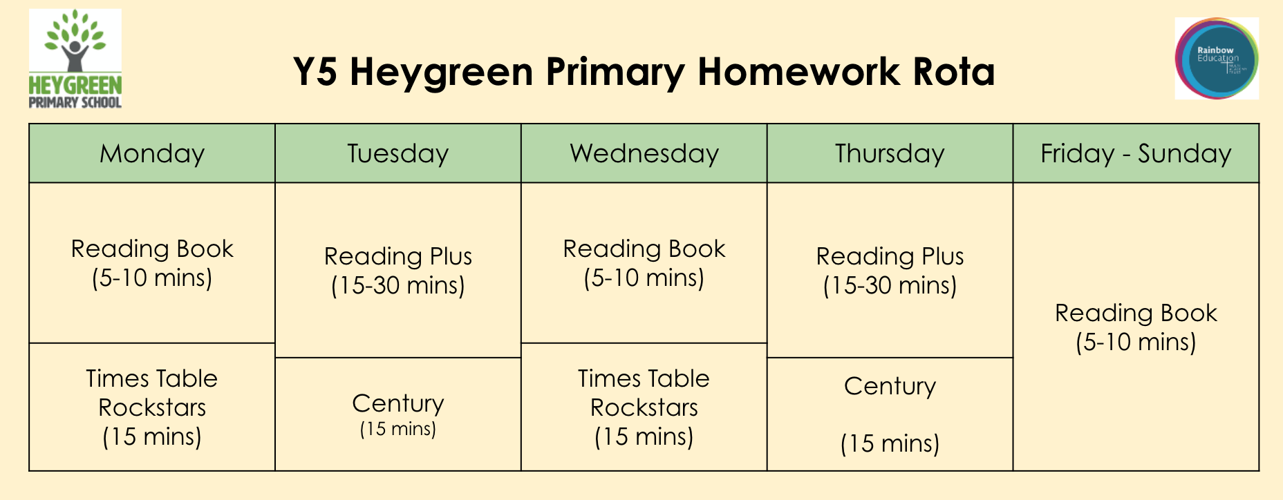 Here is the homework timetable for Year 5 and Year 6: